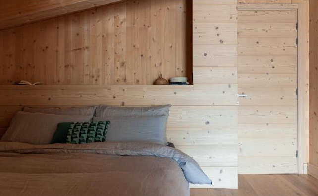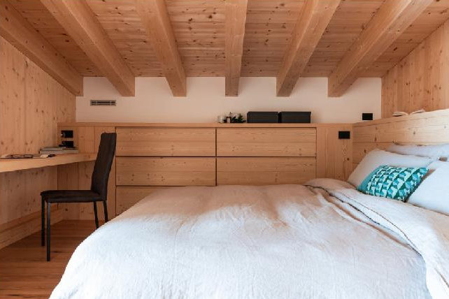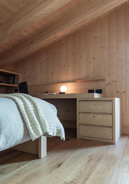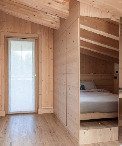 Il progetto è stato sviluppato con grande attenzione alla sostenibilità, adottando soluzioni costruttive all’avanguardia per garantire un ambiente salubre, accogliente e performante dal punto di vista termico. L’intervento ha incluso la realizzazione di una copertura e pareti in fibra di legno, materiali isolanti naturali che assicurano eccellenti prestazioni in termini di comfort climatico. Inoltre, la posa di serramenti in larice a triplo vetro ha permesso di ottimizzare l’isolamento termico e acustico, migliorando il benessere abitativo in ogni stagione.